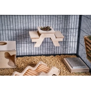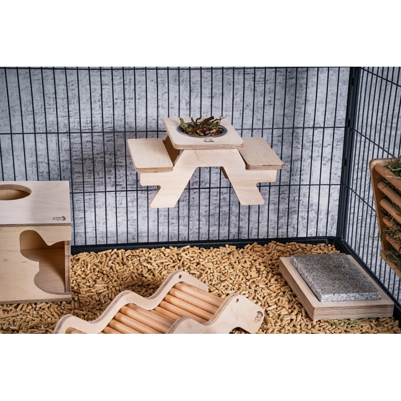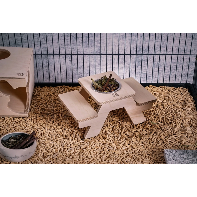 Przedstawiamy ekskluzywny stolik z ławeczkami dla Twojego gryzonia, który łączy w sobie elegancję i funkcjonalność. Stolik z ławeczkami nie tylko urozmaica przestrzeń życiową Twojej szynszyli czy koszatniczki, ale także tworzy idealne miejsce do spożywania przekąsek.